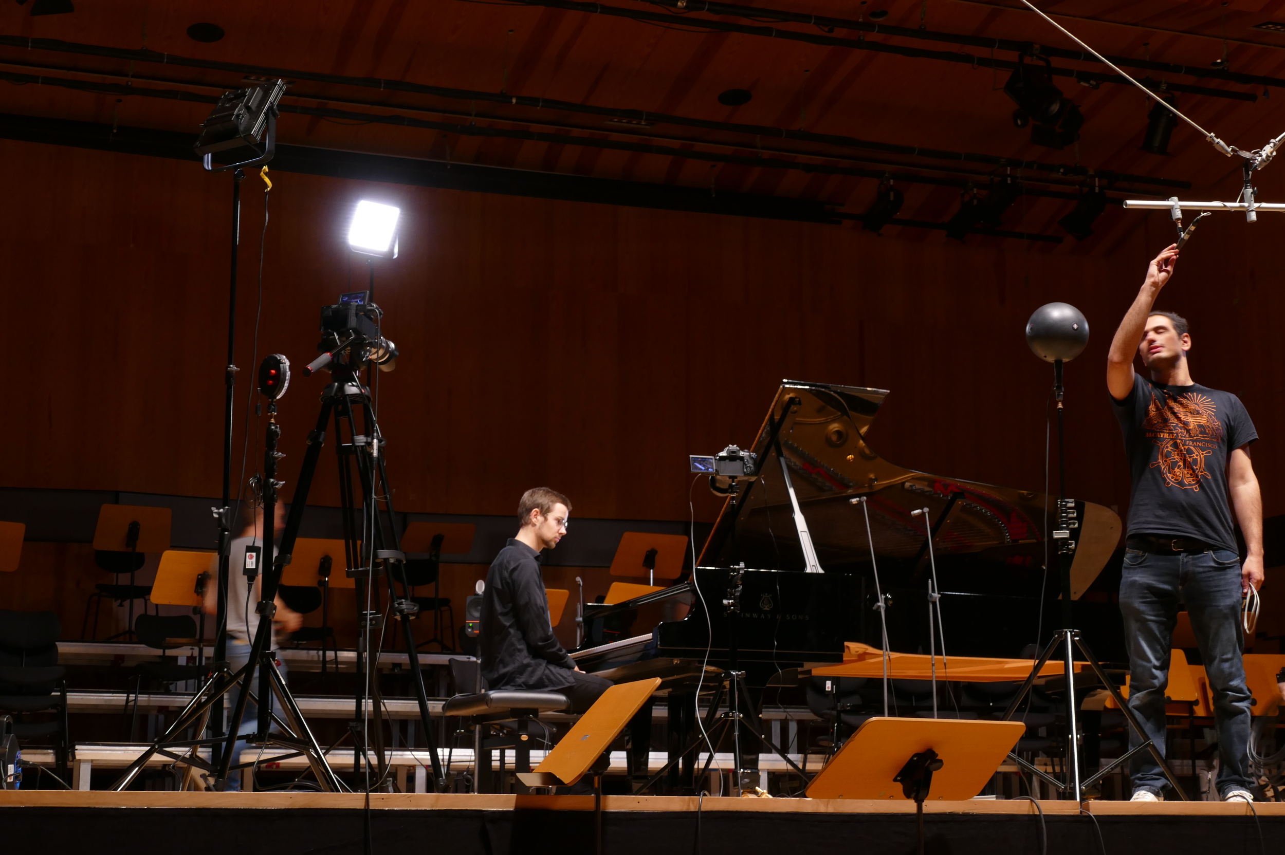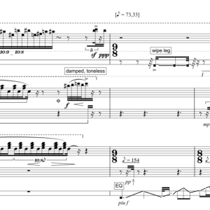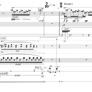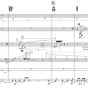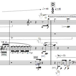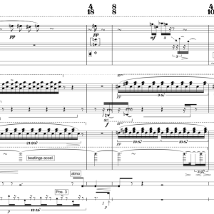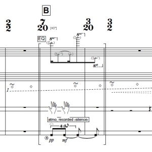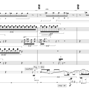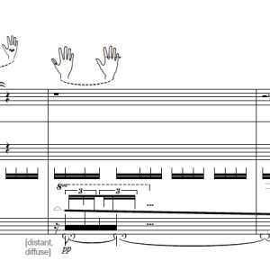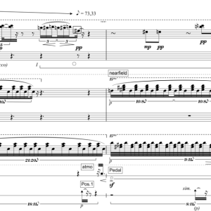 flankiert wird, welche aus Klavieraufnahmen aus großer Entfernung bestehen (Foyers, angrenzende Räume), wird die raumakustische Wahrnehmung des realen Konzertsaals virtuell um angrenzende Räume ergänzt und die Fokussierung und Raumortung auf der Bühne destabilisiert. In hybriden Zuspielsituationen, in welchen zudem nicht mehr eindeutig wahrnehmbar unterschieden werden kann, was live und was als Sample zugespielt ist, wird der Aspekt der Echtheit ontologisch destabilisiert. Zugleich wird jedoch die Wahrnehmung bei diesem Versuch der Unterscheidung potenziell geschärft. Insgesamt wird ein akustischer Vorder-, Mittel- und Hintergrund (im Sinne der akustischen Photographie) erfahrbar und der Faktor der räumlichen Distanz zum Kompositorischen erhoben. Wird ein Klang oder eine Partie durch mehrere Mikrophone in unterschiedlicher Positionierung zur Klangquelle aufgezeichnet und diese Spuren zeitlich versetzt als Varianten eingesetzt (durch Jump Cuts), entsteht eine „Raumfarbe“ aus Variationen der Hörposition. Der farbliche Aspekt entsteht durch die unterschiedliche Aufzeichnung der Richtcharakteristik und gegebenenfalls der „Medienfarbe“ der unterschiedlichen Mikrophone. Die Montage verschiedener solcher Raumfarben lässt eine Art „Raumfarbenmelodie“ im Sinne Schönbergs Klangfarbenmelodie denken. Zugleich sind die Fernklavieraufnahmen in Periplus Symbol und Spürbarmachung des Vergangenen: Es handelt sich um Material/-Archivquellen der Klavierliteratur. Das geschichtlich Entfernte korreliert hierbei mit der akustischen Entfernung. Letztere wird zum Symbol des geschichtlichen Abstands. Die geschichtliche Verortung, das Eingeschriebene, ist als Spur (Derrida) oder Schweif in der Entfernung gerade noch diffus wahrnehmbar.